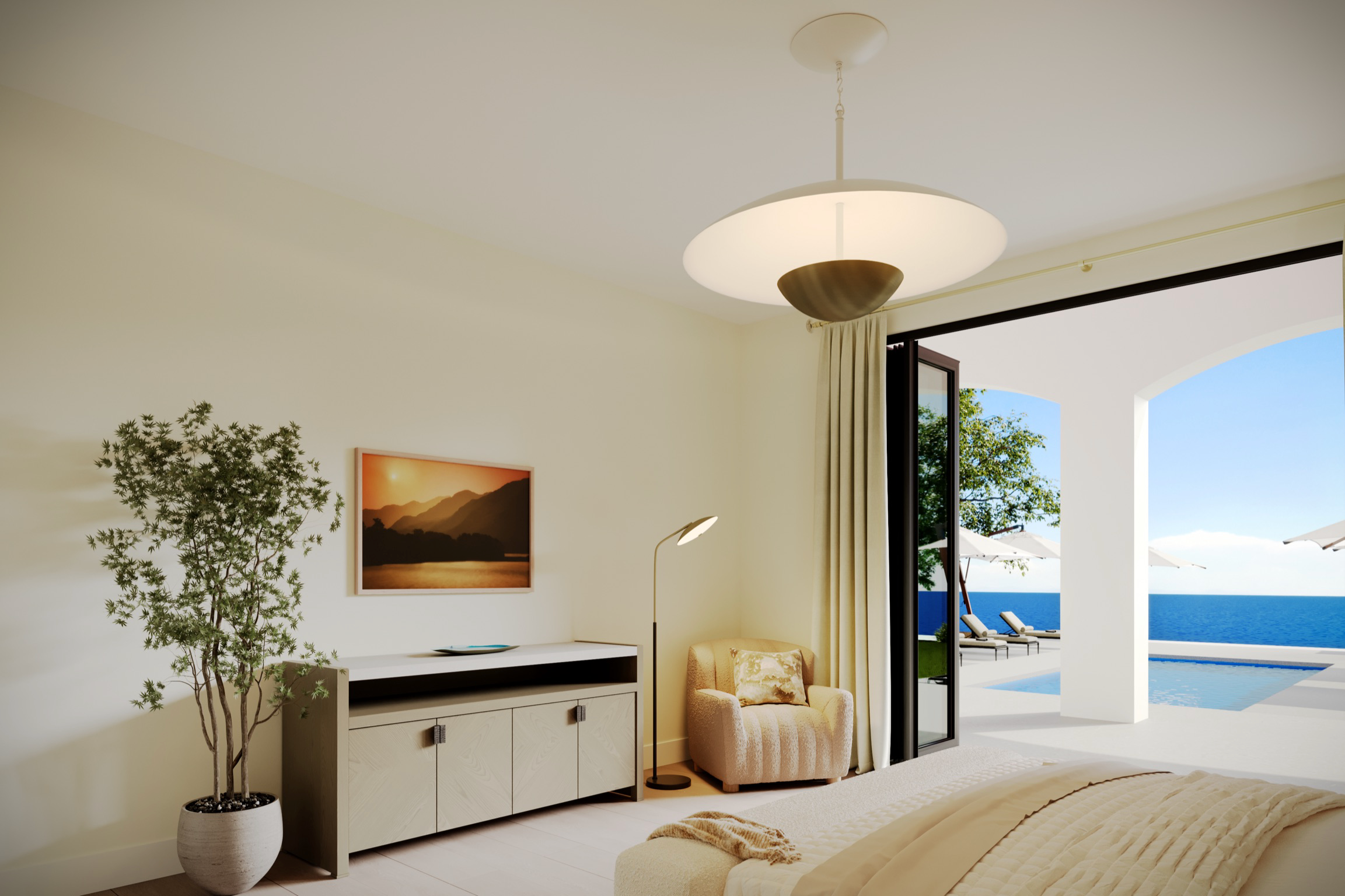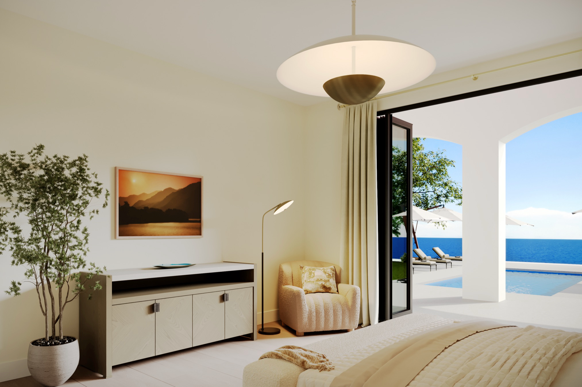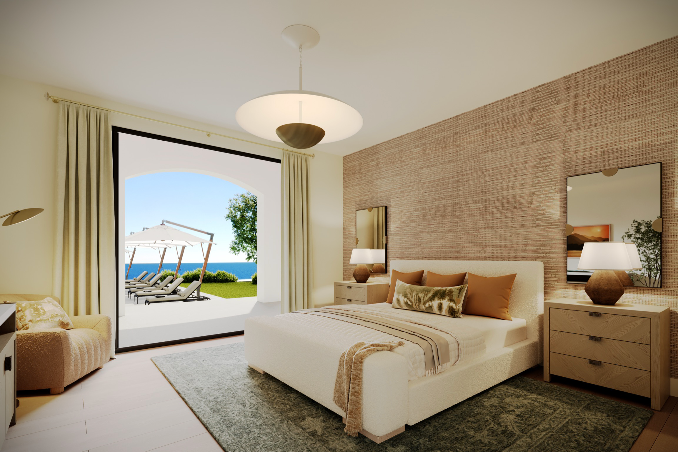 Everything about the bedroom reflects the sea beyond it's glass doors. From the textured wallpaper and bed, to the wood tones of the furniture, to the reflection of the mirrors, the soft sand tones and creams of the soft linens, to the greens of the rug and sunset colors of the pillows, we are surrounded by serenity which coaxes us to forget the world outside these walls.