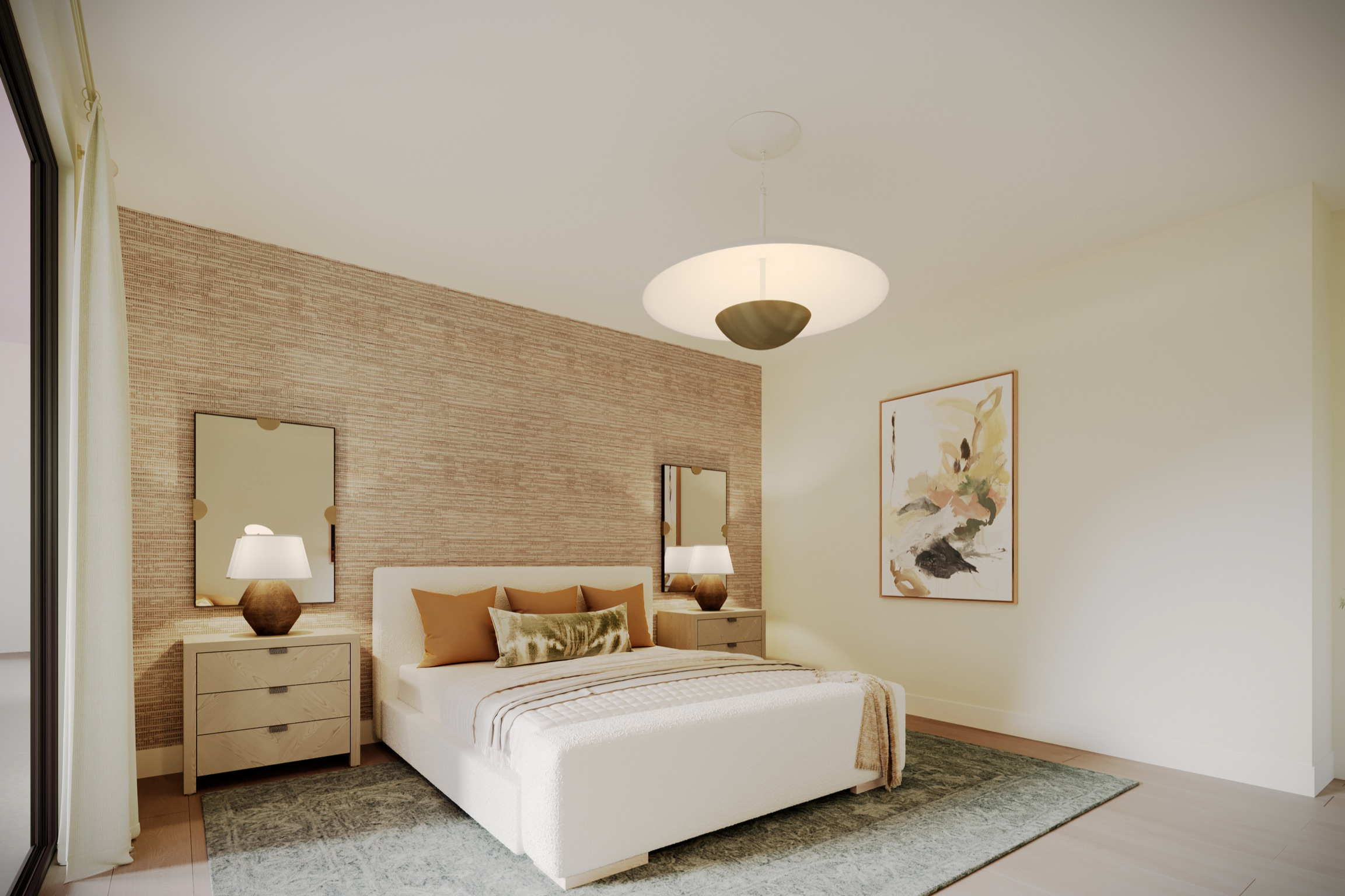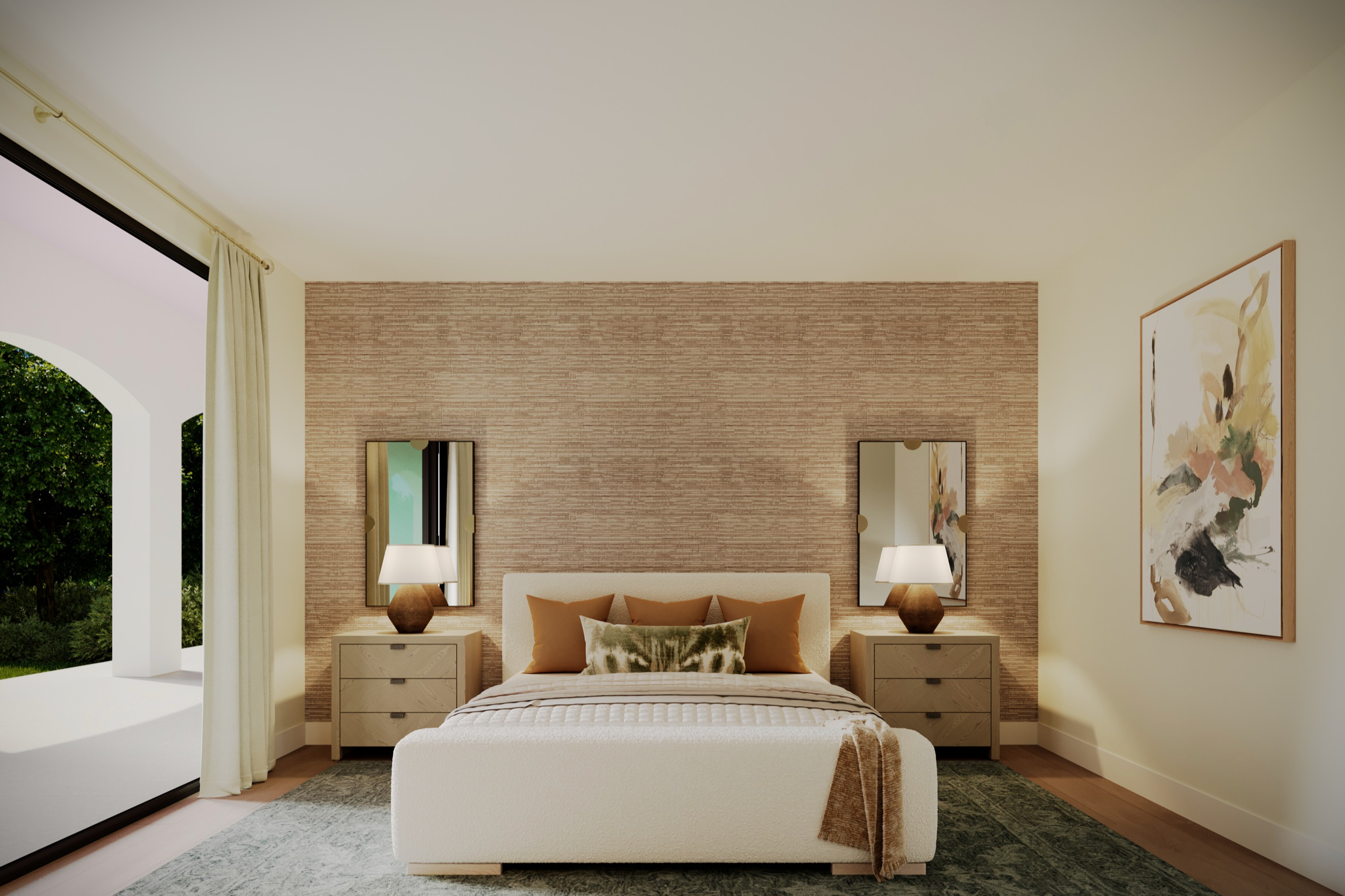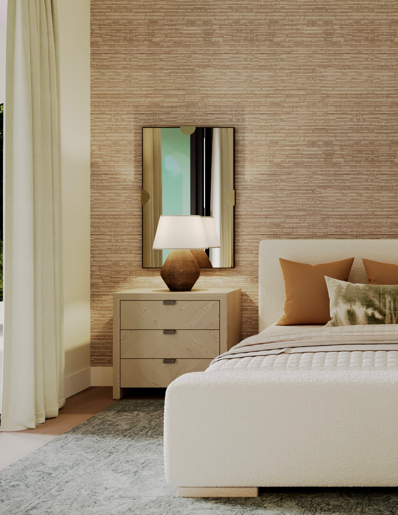 The bed is available in queen, king, and cal king with gray oak legs and snow boucle performance fabric. The nightstands with ample storage feature cathedral ash in a stunning pattern with textured pulls. The large white and bronze pendant diffuses light sets the mood. A cozy corner features a reading light and textured chair. As with all our designs, you can select the artwork and accessories package of your choice during checkout.