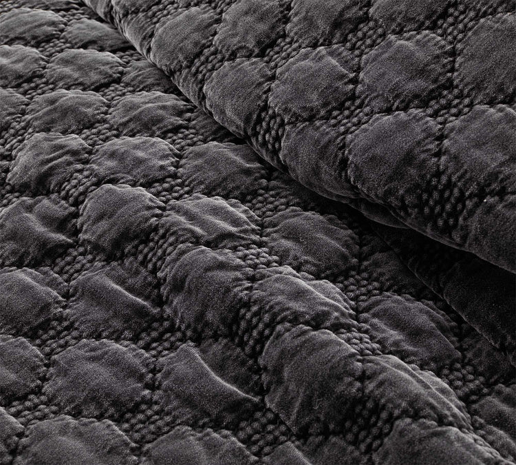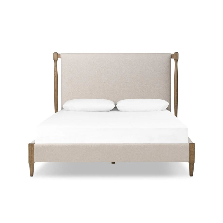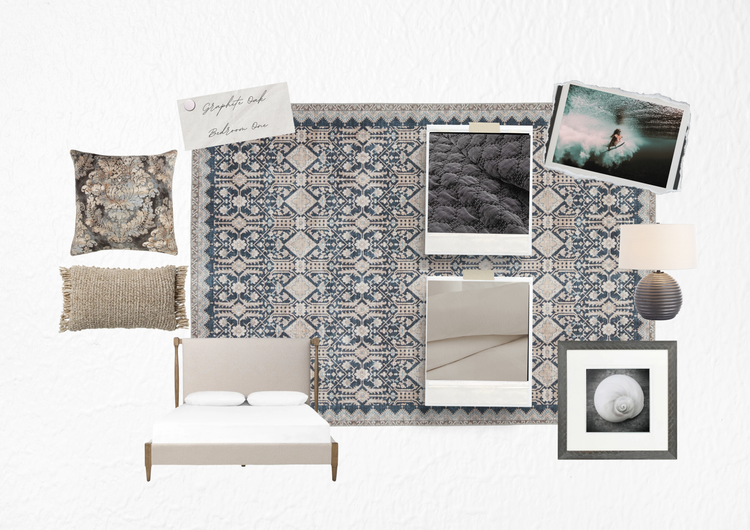 Relax into our Graphite Oak Bedroom where traditional patterns mix with dark tones to create a relaxed and moody vibe. The space is grounded with medium wood tones. A large whitewashed dresser offers lots of storage. Surf and shell art hint at the sea just beyond the hills. The patterned performance rug in inky blues and beige tones ties everything together.