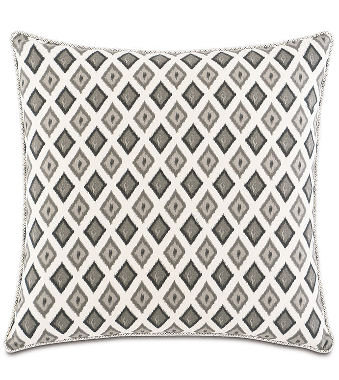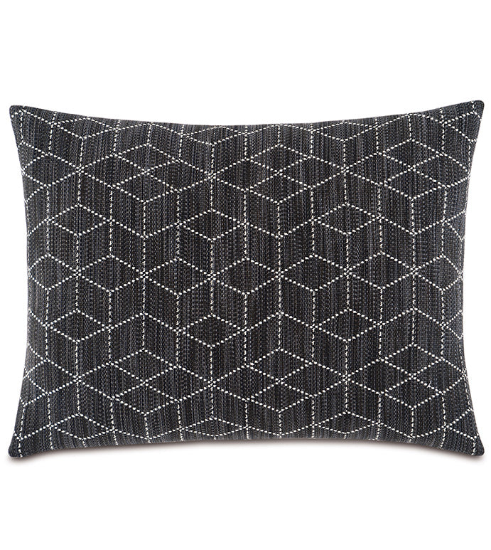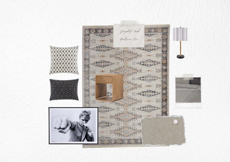 Geometric patterns, contrast, blacks, and creams create a nuanced and edgy design. The bed upholstered in a performance textured boucle grounds the space. The performance rug and gritty artwork add additional layers of pattern to the mix. Rope-wrapped lamps with fluted linen shades sit atop modern nightstands. The modern curved dresser with a plinth base provides extra storage.