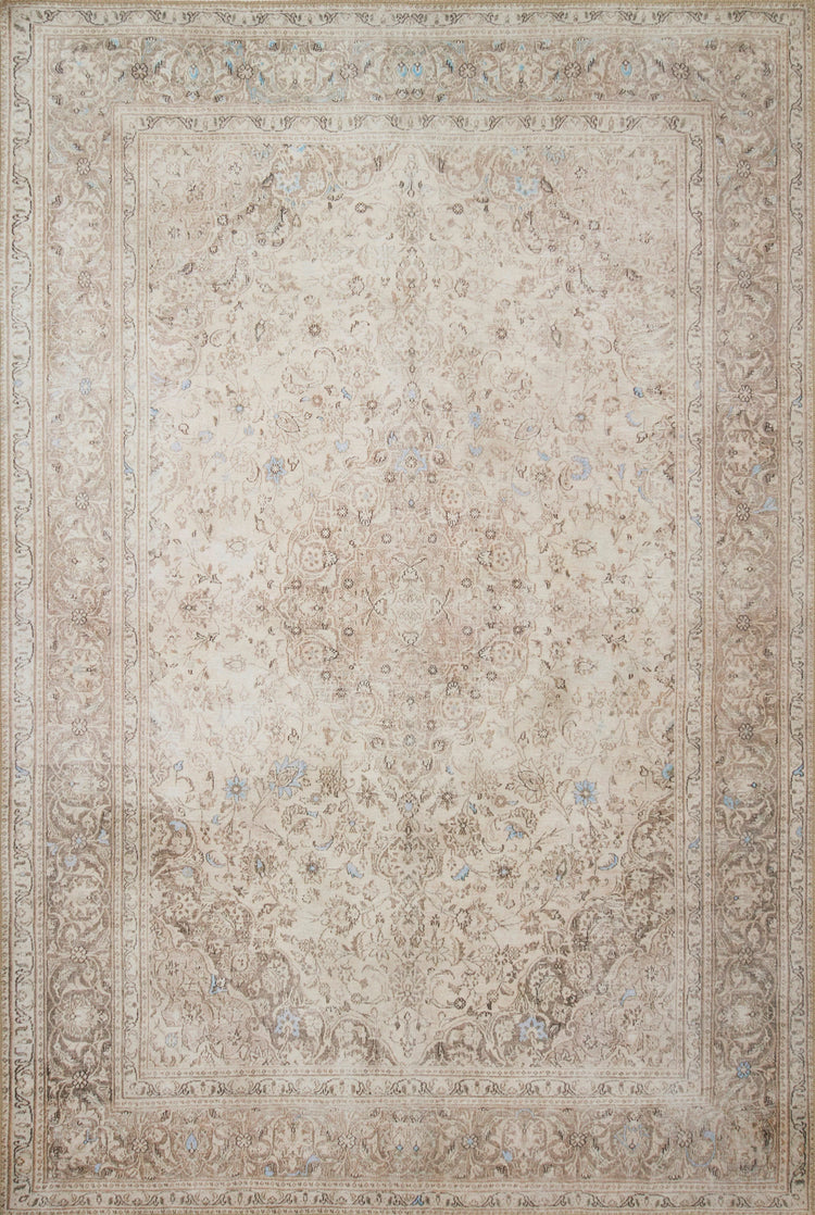 Soft ombre hues of blues, grays, and camel flow effortlessly through this bedroom, creating a serene and layered environment. Lush bedding combines muted colors and soft textures. A traditional cream, patterned rug lies under a boucle and wood bench. Antique mirror softly reflects the lamplight as the day unwinds.