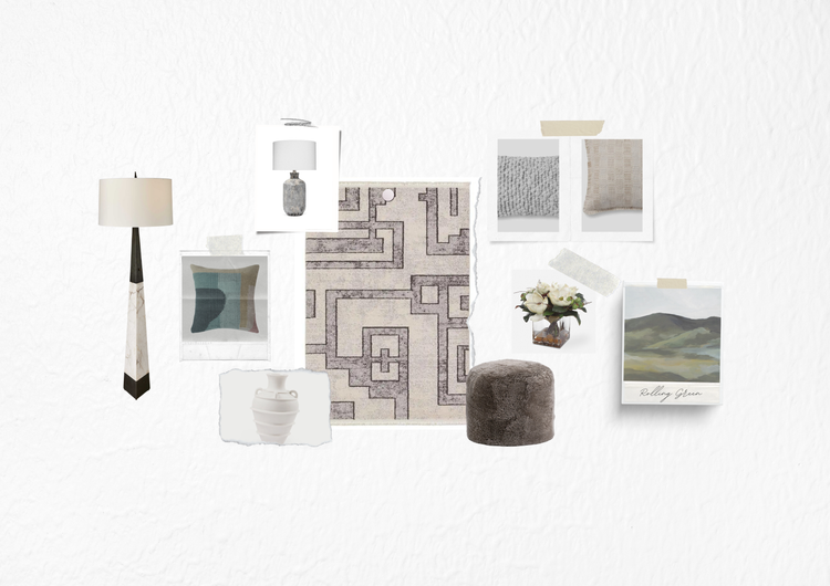 The soothing interplay of creams and grays mixed with greens and lots of texture in pillows, poufs, and lamps. Carefully curated landscapes and abstract art brighten the space while the reclaimed pine mirror grounds it. Faux botanicals bring the outdoors inside without the maintenance.
